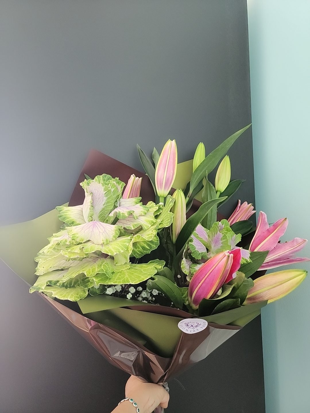 The shining bouquet is ornamental Kale flowers with the strikingly beautiful and fragrant Oriental lilis. The ruffled Kale blooms contrast with the trumpet shaped lily petals and the fresh greenery. This bouquet is perfect for sophisticated gift at important celebrations.