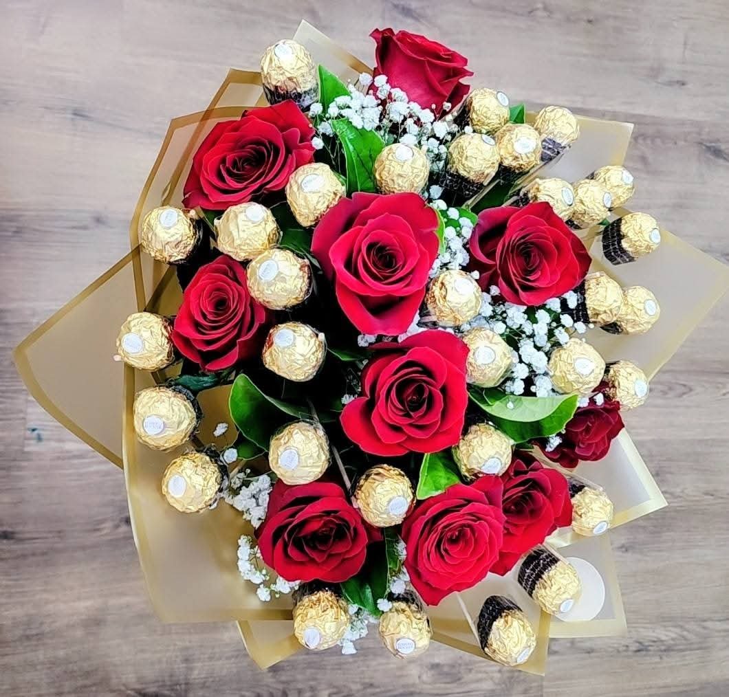 A perfect blend of romance and sweetness featuring 10 long stem red roses paired with two dozen Ferrero Rocher chocolates. An irresistible gift to express love, passion, and appreciation on any special occasion.