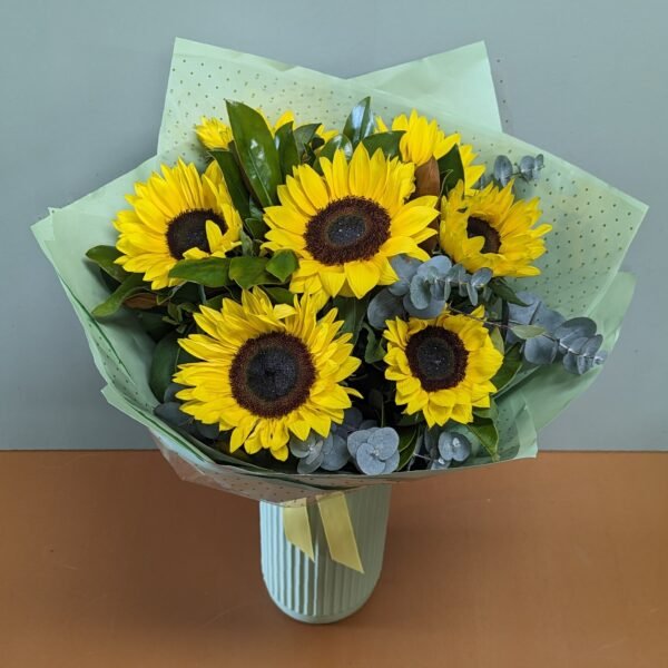 Sunshine sunflower bouquet is a bright and cheerful bouquet overflowing with happy sunflowers and their natural green leaves. Symbolizes joy, adoration, and positivity. A perfect mood-lifter.