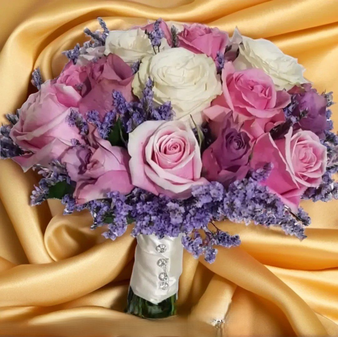 Enchanting rose bouquet featuring a romantic blend of pink, mauve, and white roses, accented with fragrant lavender. Finished with elegant satin & rhinestone ribbon.