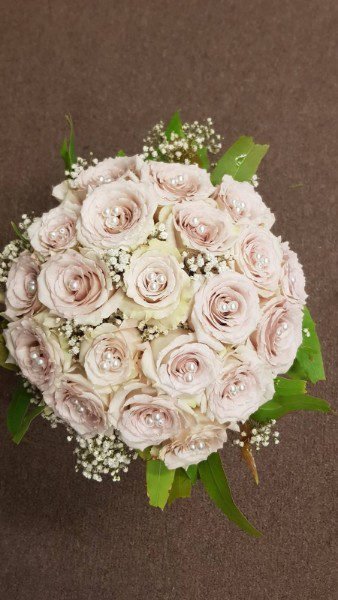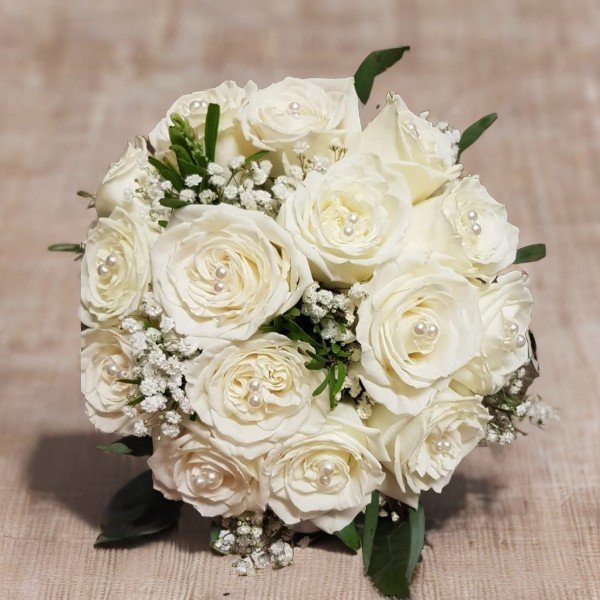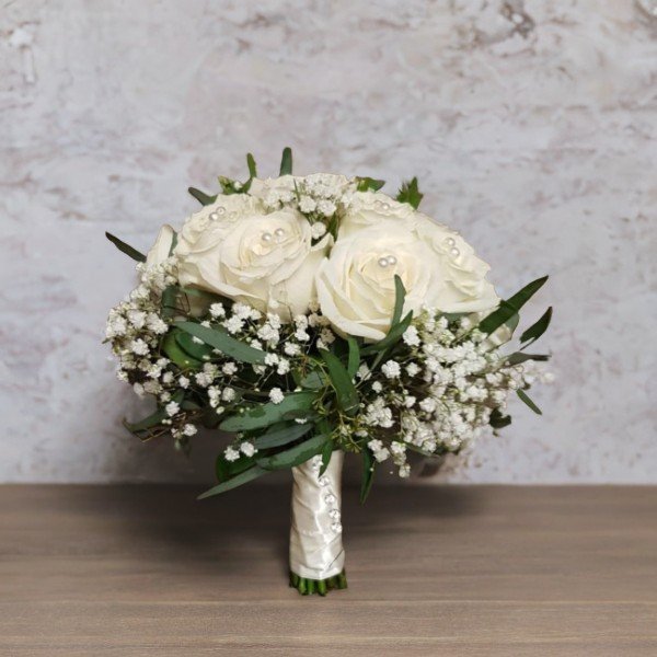 Classic round bridal bouquet featuring pristine white roses, airy Baby’s Breath (Gypsophila), and subtle greenery. Accented with pearls for timeless charm.